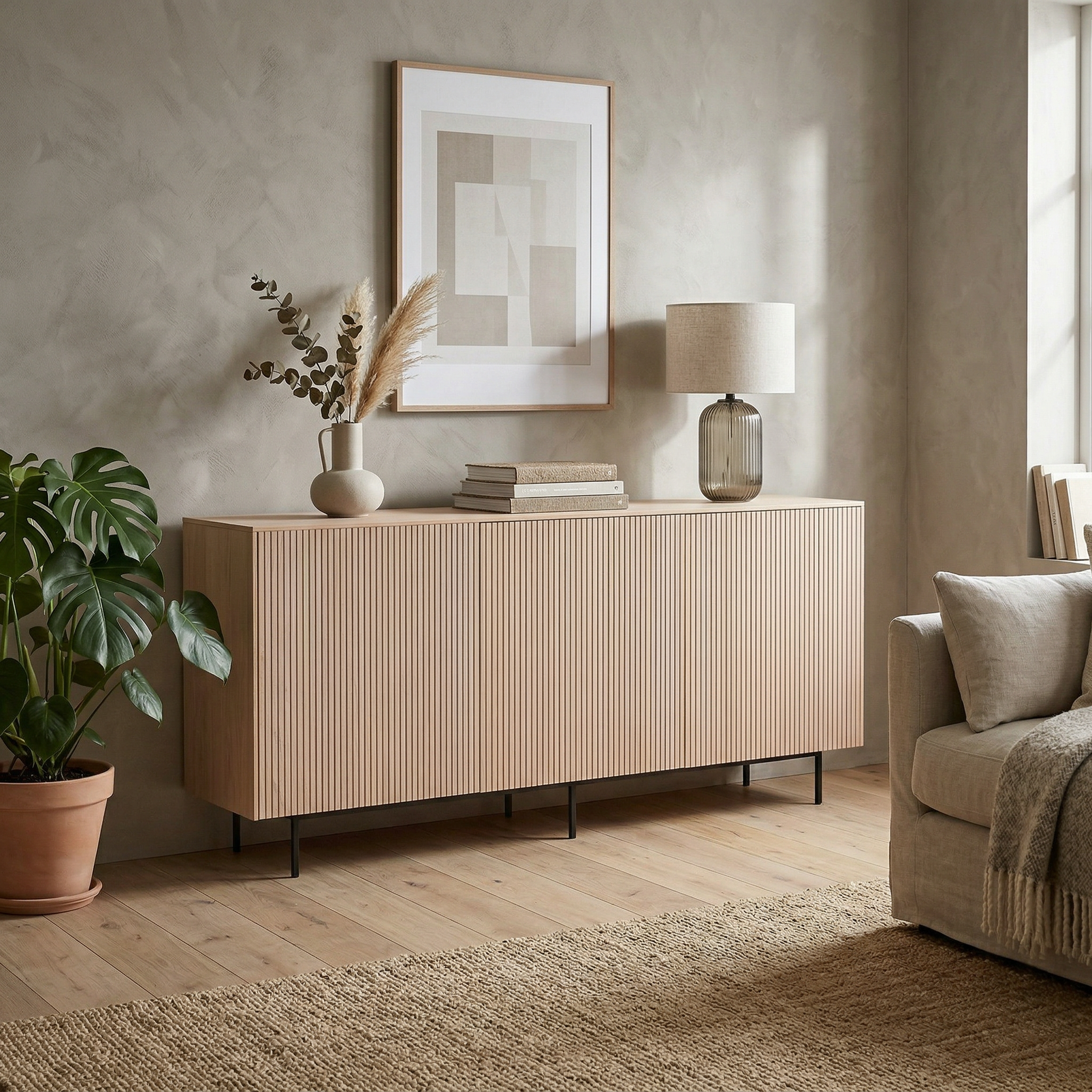 This elegant sideboard in a light wood finish is the ultimate combination of function and style. With its modern line pattern and minimalist design language, it’s a perfect choice for those who want a practical storage solution without compromising on design. The Hanö Sideboard rests on slim, black metal legs that give an airy and modern feel, while standing stable and secure.
