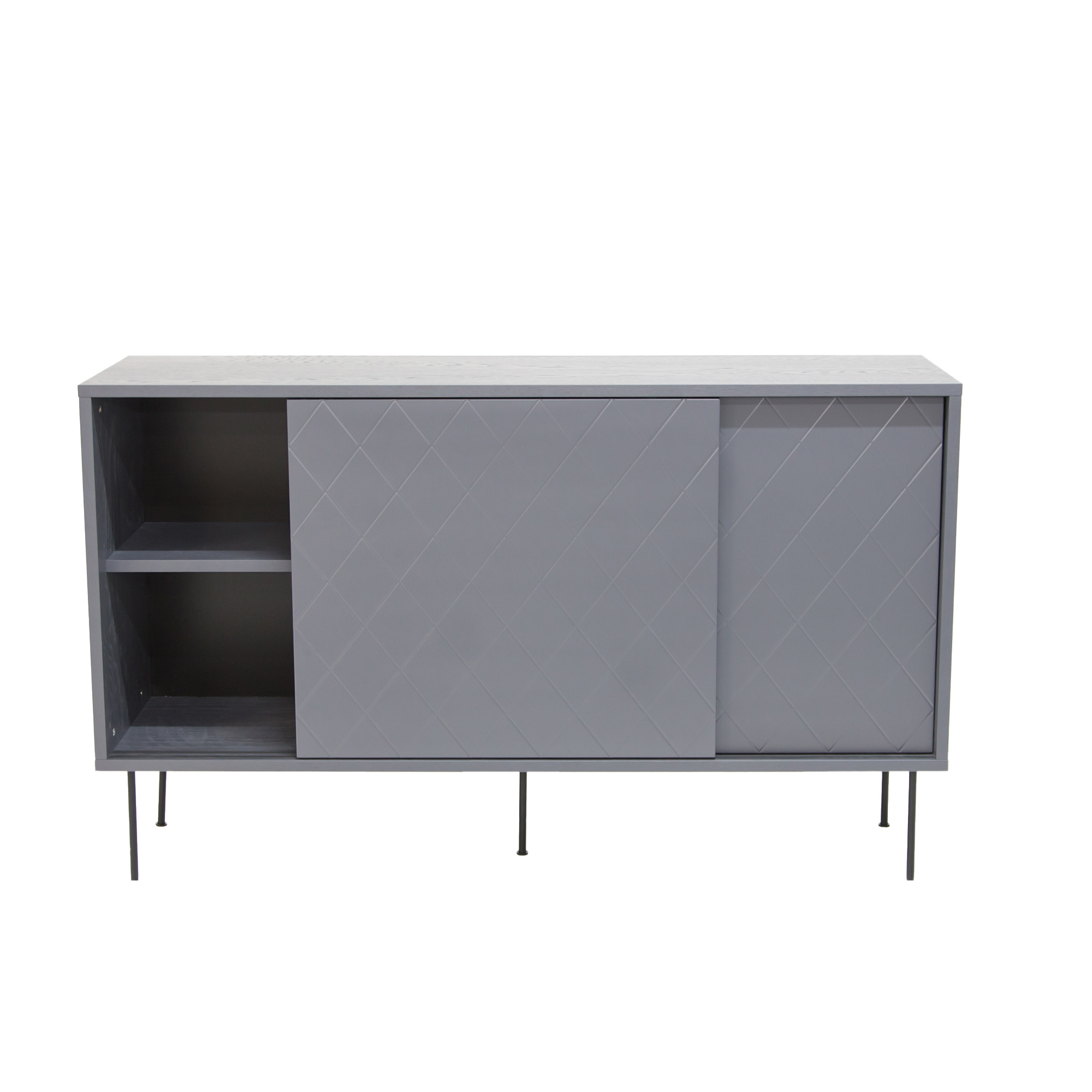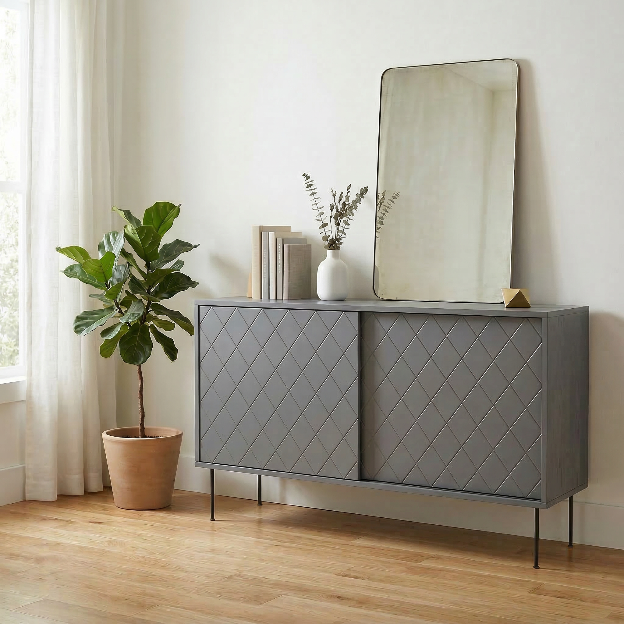 Sleek sideboard with decorative geometric fronts, offering a modern and elegant look. Spacious storage organizes everything from dinnerware to everyday essentials. Slender legs create an airy feel, perfect for living and dining rooms.