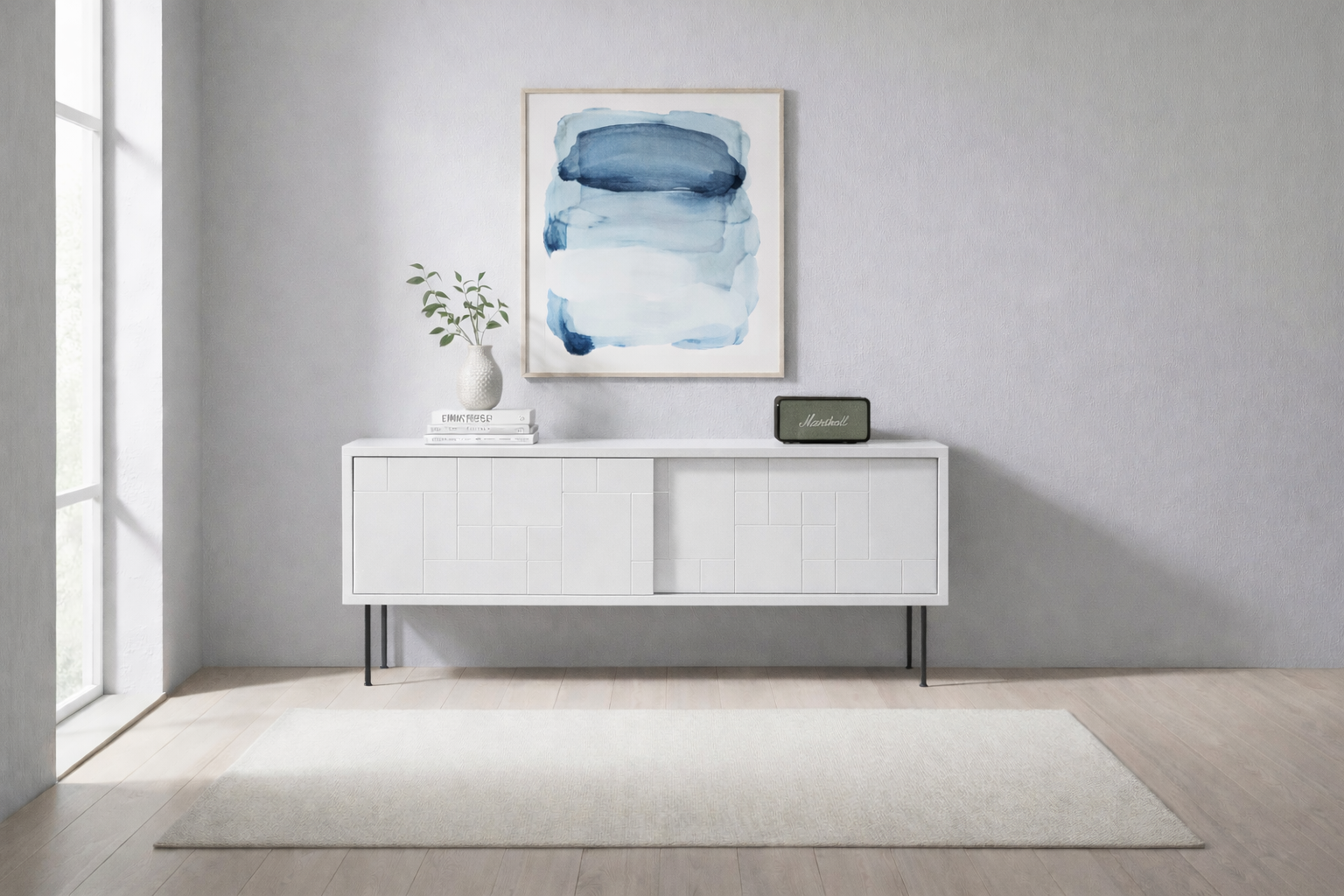 Create a sleek and sophisticated atmosphere in your living room with this elegant TV stand, designed to match the geometric series. With a front of sliding doors adorned with subtle yet striking geometric patterns in a matte finish, this piece of furniture becomes a modern addition to your decor.