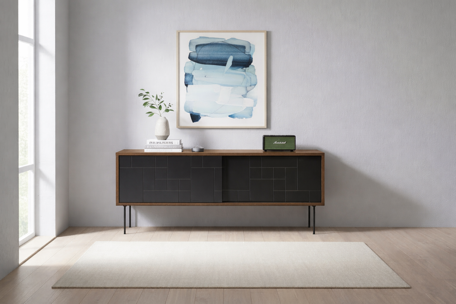 Create a sleek and sophisticated atmosphere in your living room with this elegant TV stand, designed to match the geometric series. With a front of sliding doors adorned with subtle yet striking geometric patterns in a matte finish, this piece of furniture becomes a modern addition to your decor.