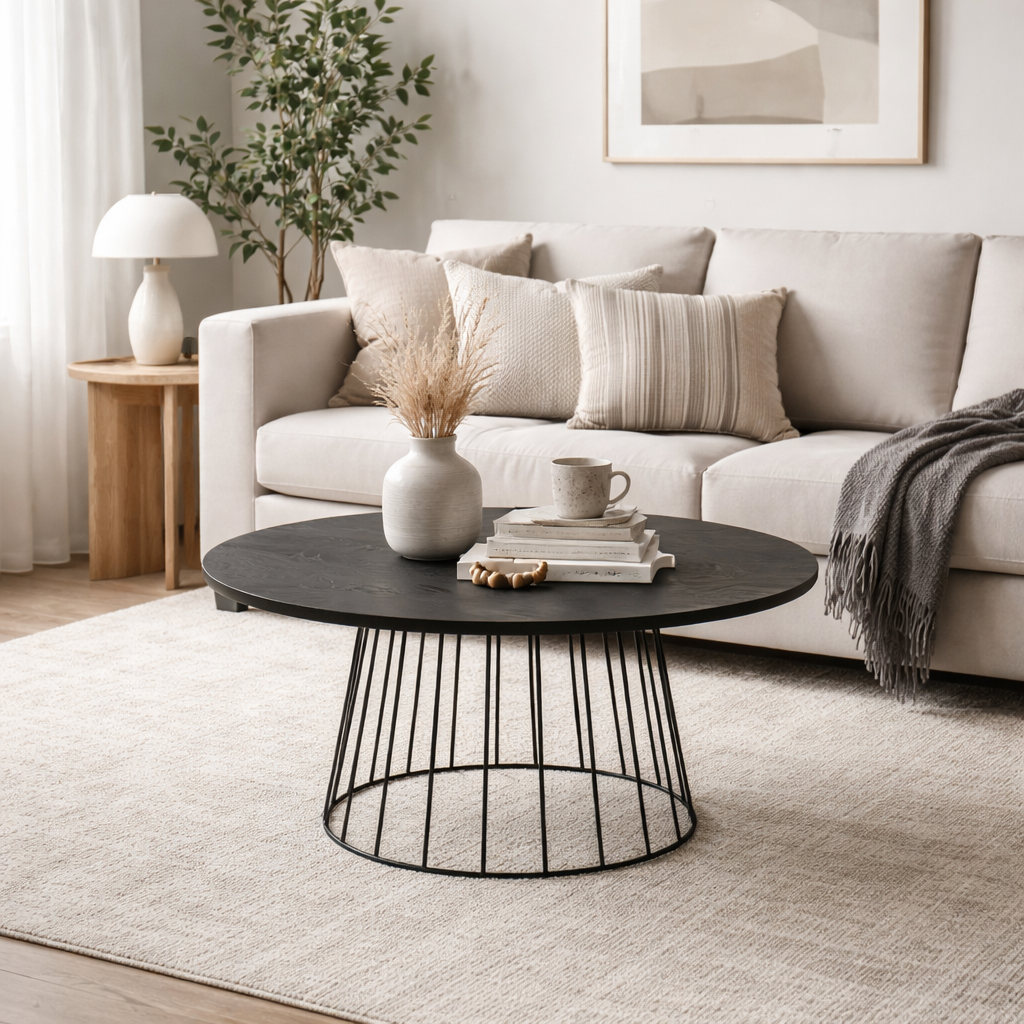 Coffee table with cone-shaped metal base and black-stained veneer top.