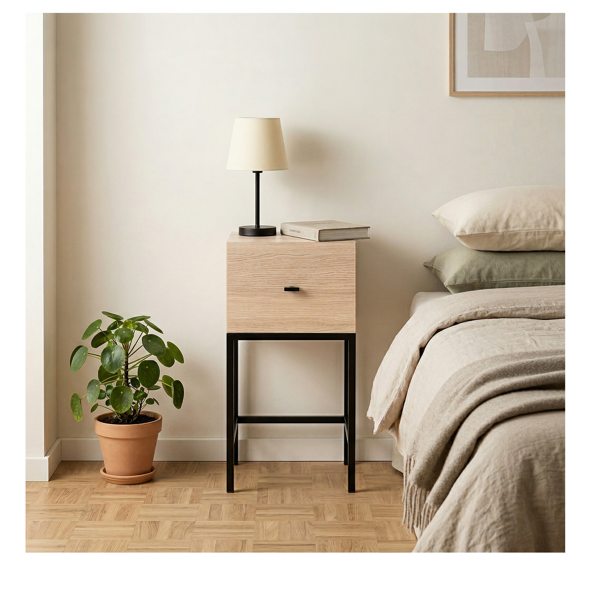 Oak veneer bedside table, black powder-coated metal frame.