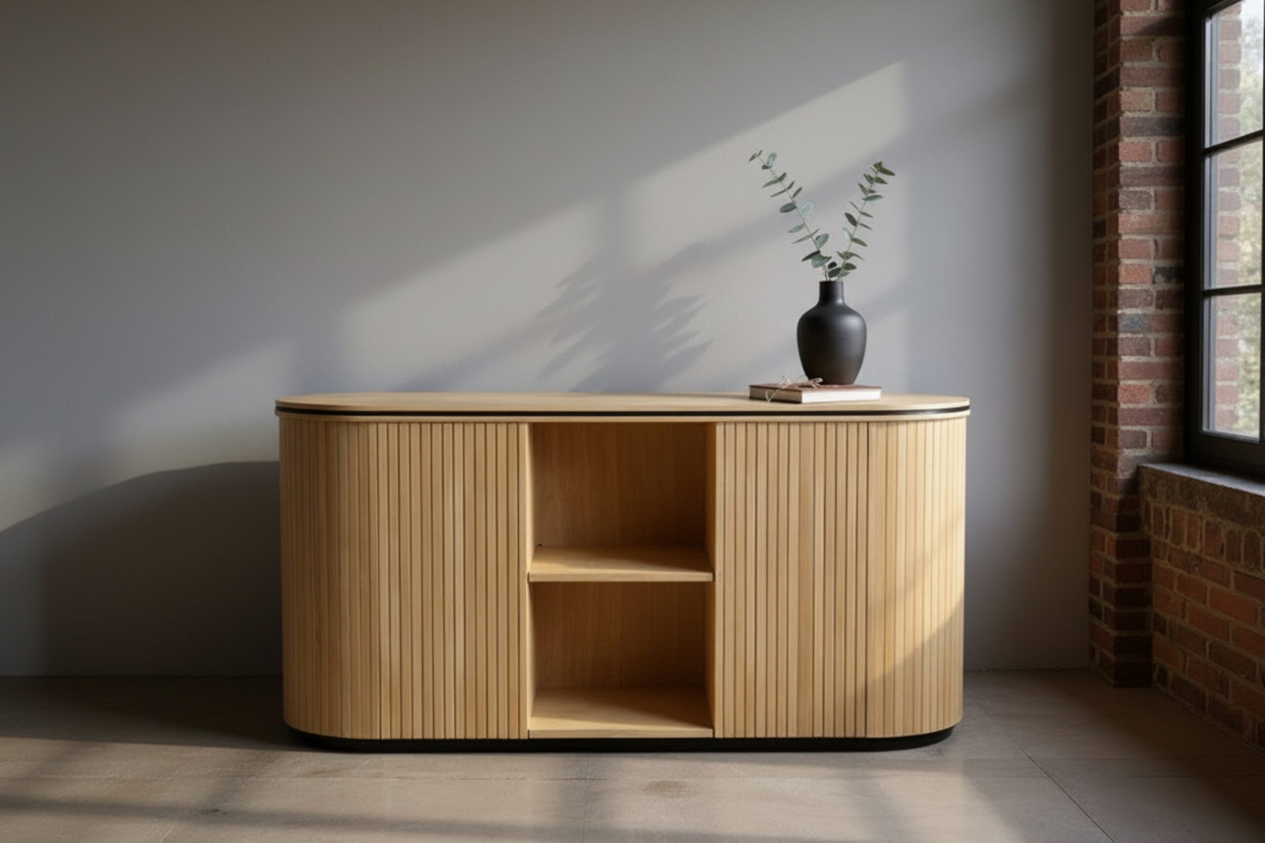 Skänk i vitpigmenterat ekfaner med en dekoration svart kant