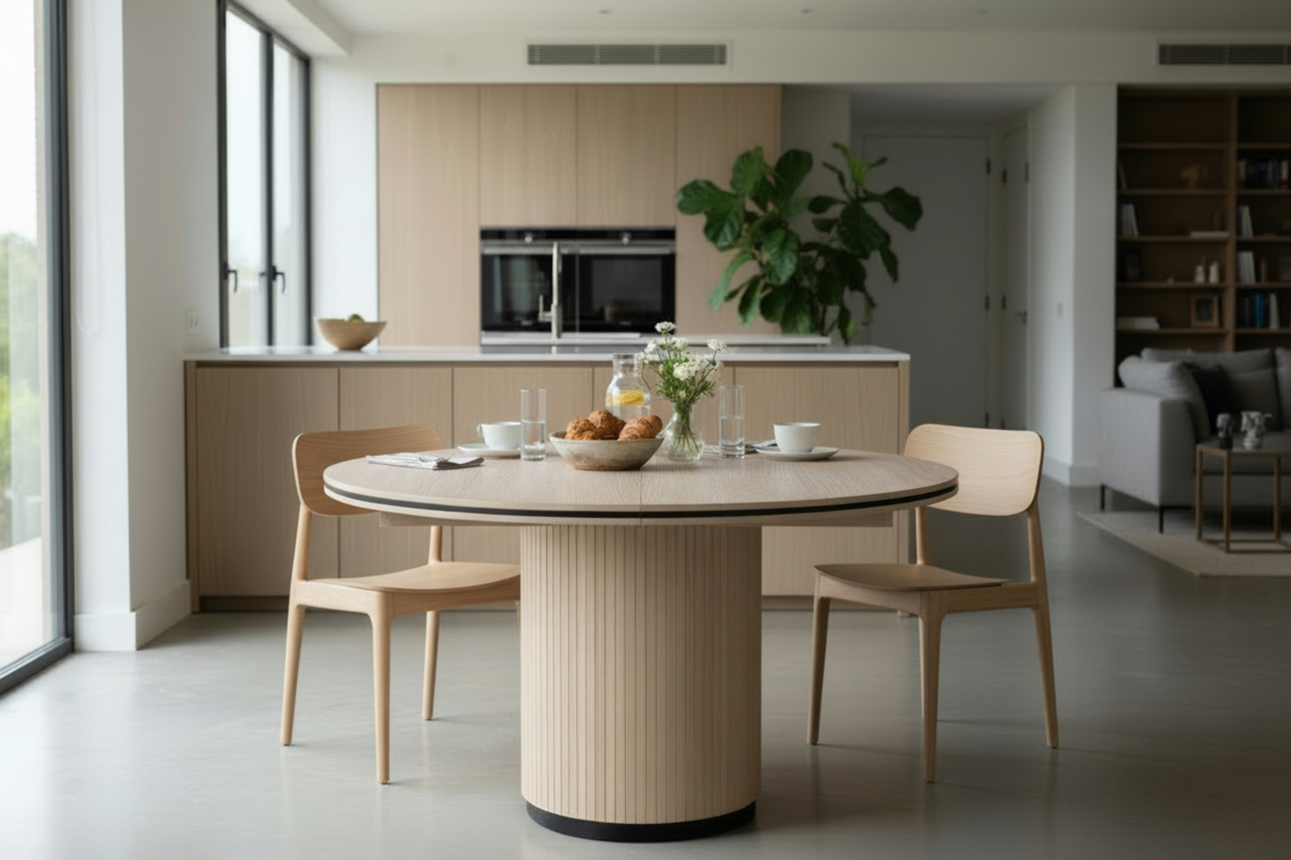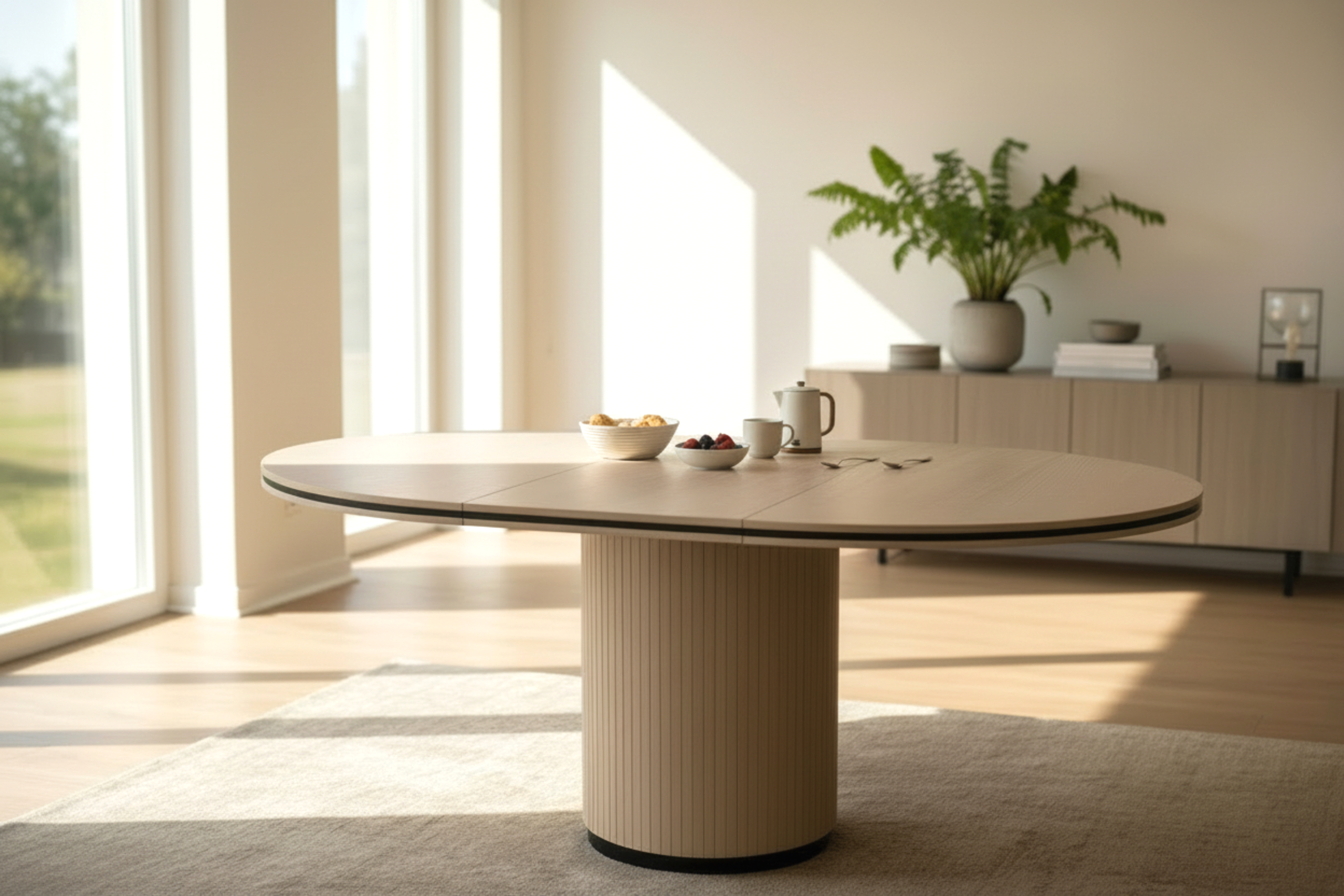 Runt matbord i vitpigmenterat efkaner med svarta detaljer. En iläggsskiva medföljer så bordet enkelt kan göras större vid behöv.