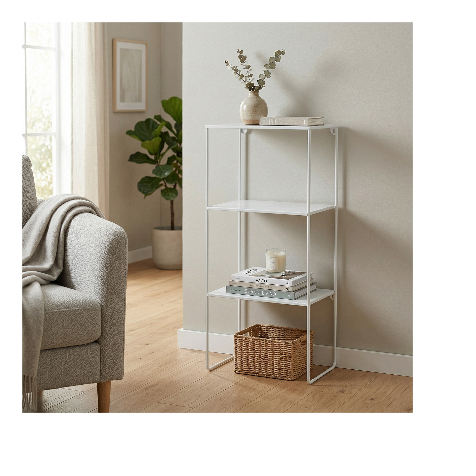 Denna moderna hylla kombinerar funktionalitet och minimalistisk design för att ge ett stilrent inslag i ditt hem. Med sina tre hyllplan och slimmade, vita metallram ger den gott om förvaringsutrymme utan att ta för mycket plats.