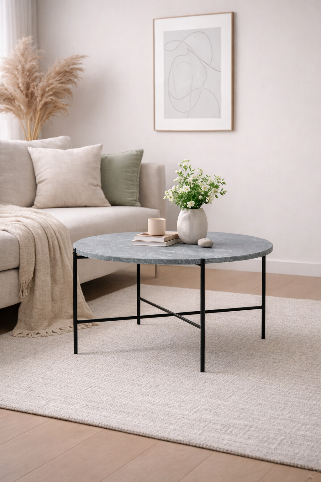 Soffbord med toppskiva i marmor och underrede i svart pulverlackerad metall.