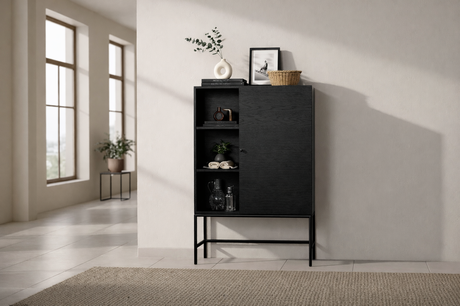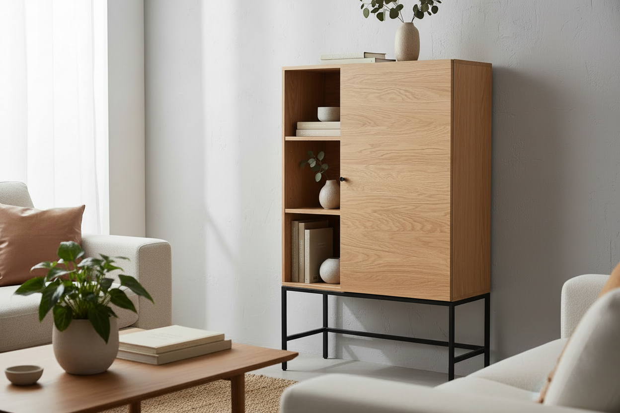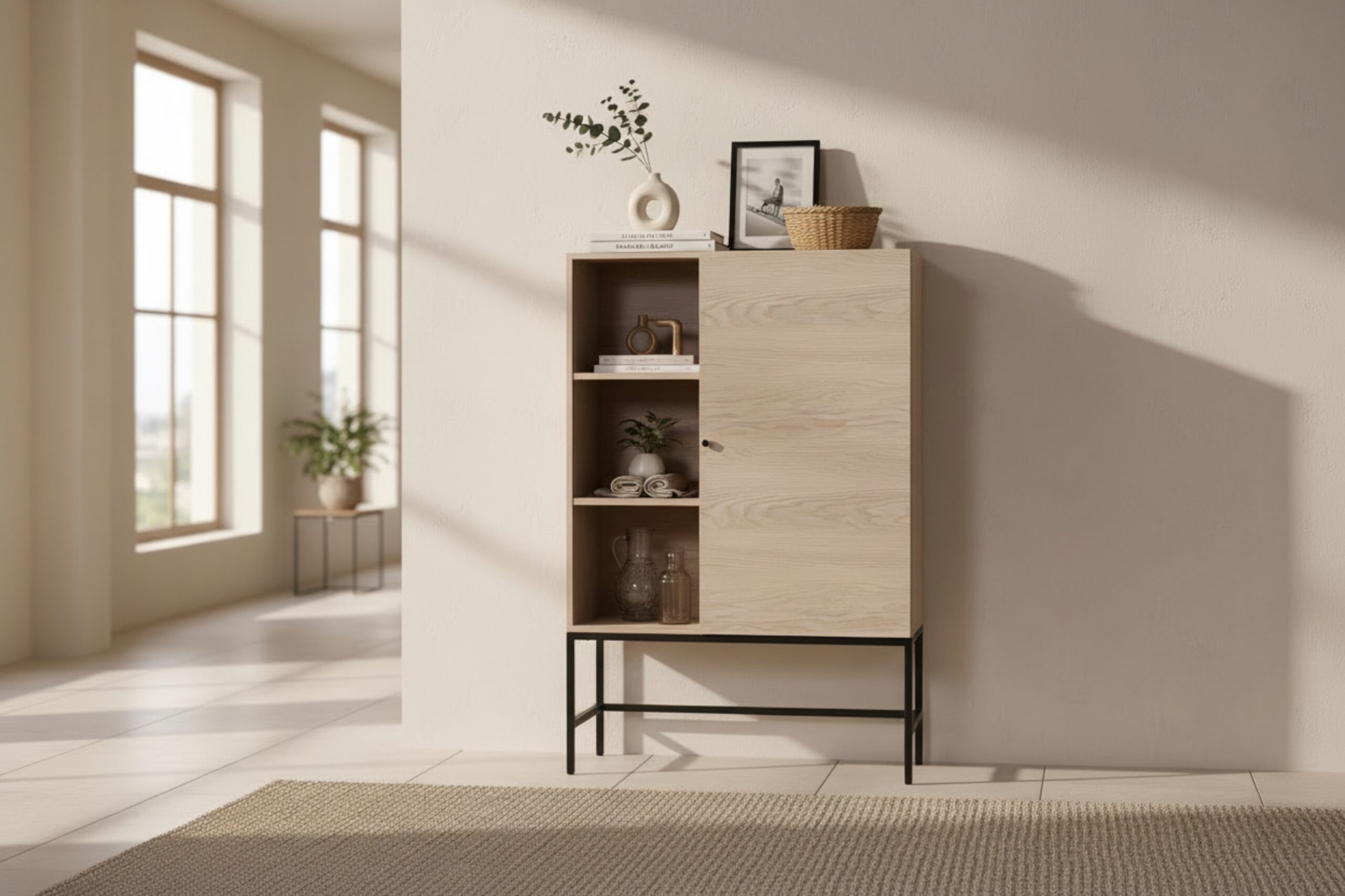 Skåpet är tillverkat av högkvalitativa material som säkerställer hållbarhet och stabilitet. Dess design reflekterar samtida trender som blandar naturliga trätexturer med industriella element.