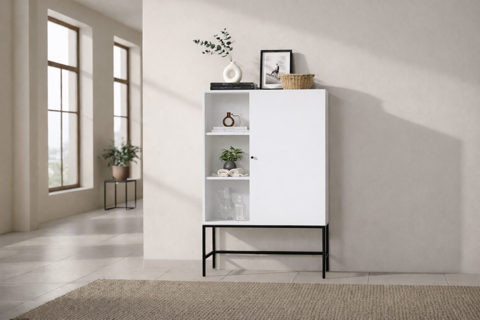 Med både öppna hyllor och ett stängt fack med en enkel dörr, erbjuder det mångsidig förvaring för både visning och förvaring av föremål.