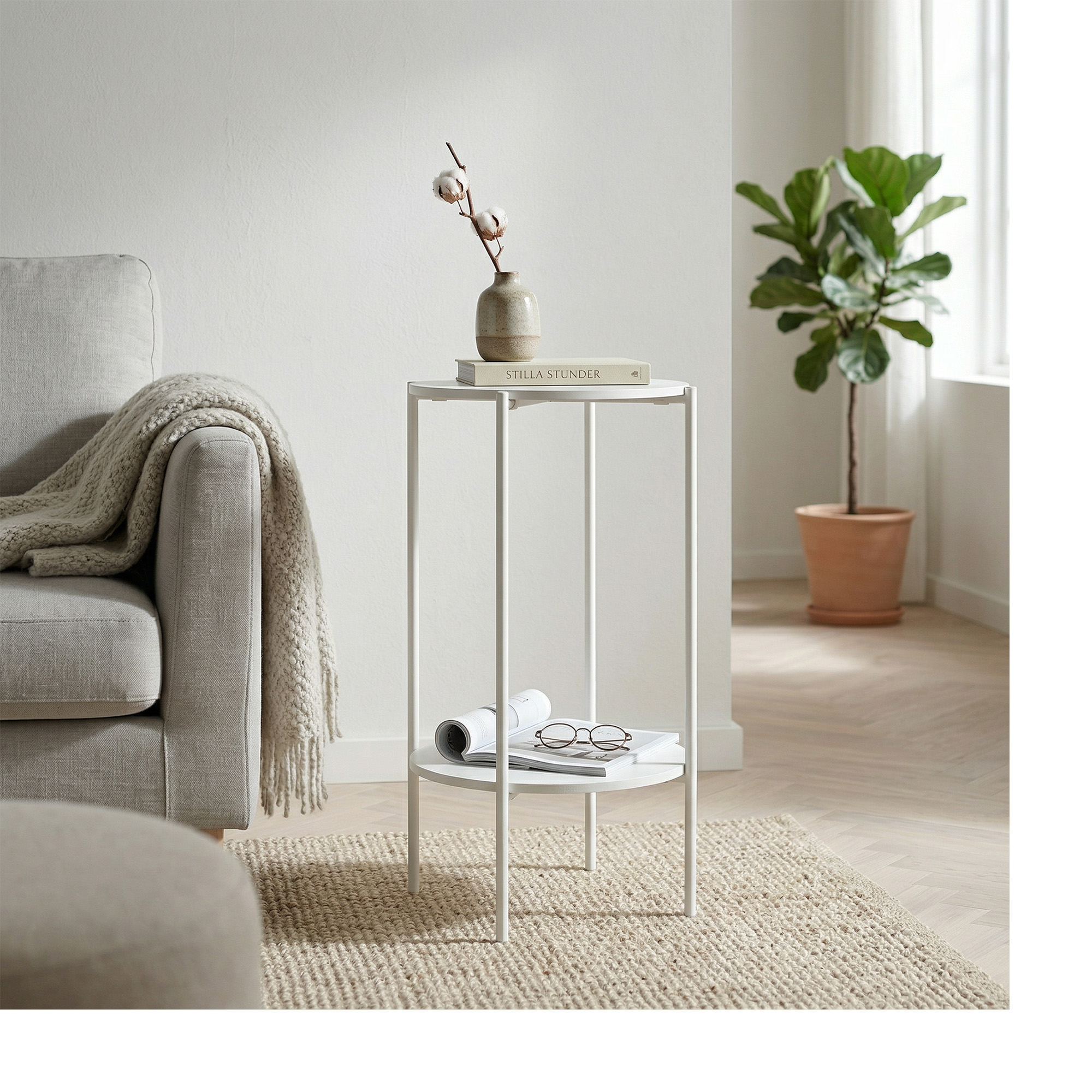 Sidobord i metall och melamin.