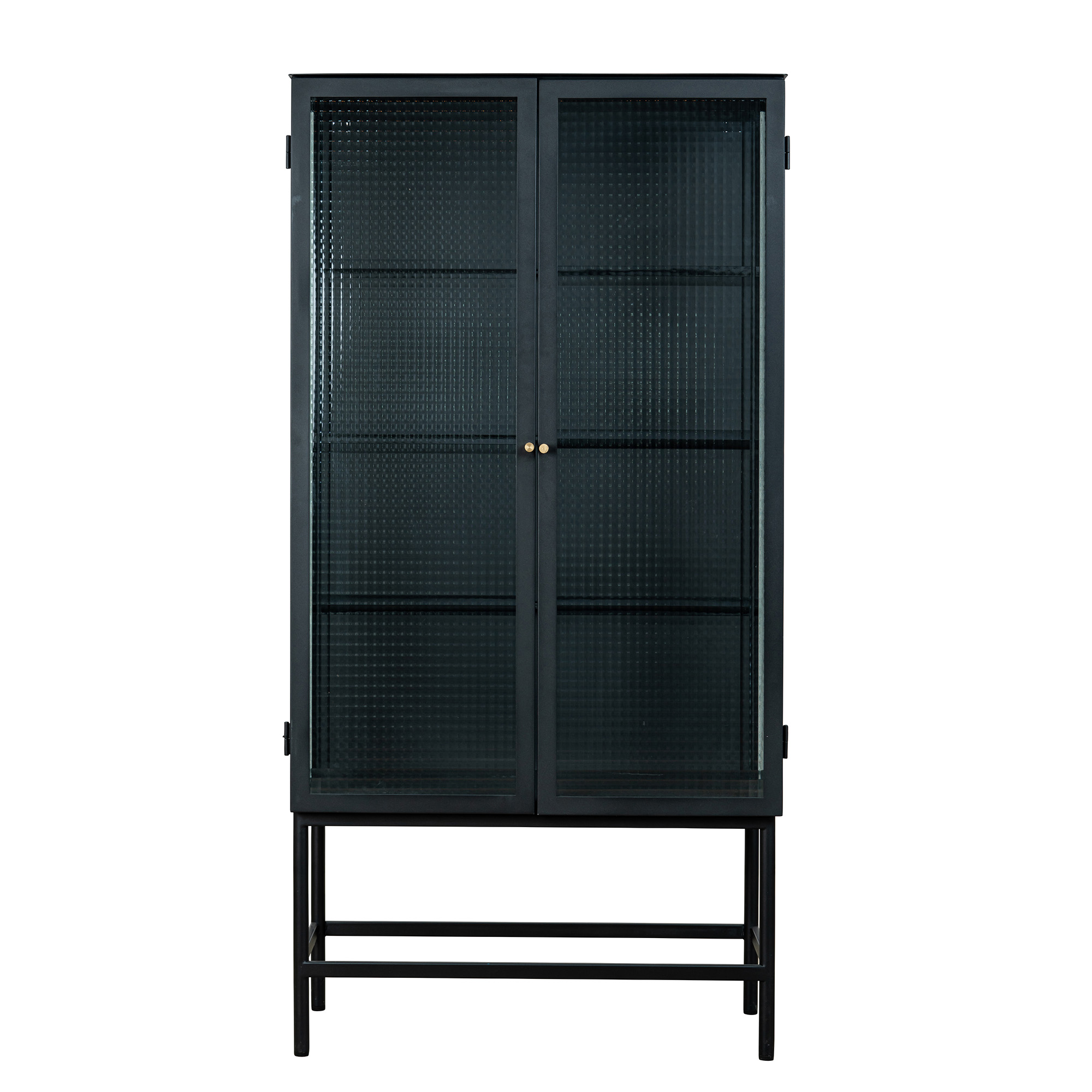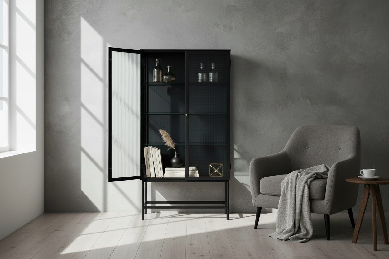 Detta stilrena vitrinskåp kombinerar industriell elegans med tidlös design. Skåpet är tillverkat i svartlackerad metall och har två glasdörrar med strukturerat glas som ger ett sofistikerat uttryck samtidigt som innehållet skyddas och dämpas visuellt.
