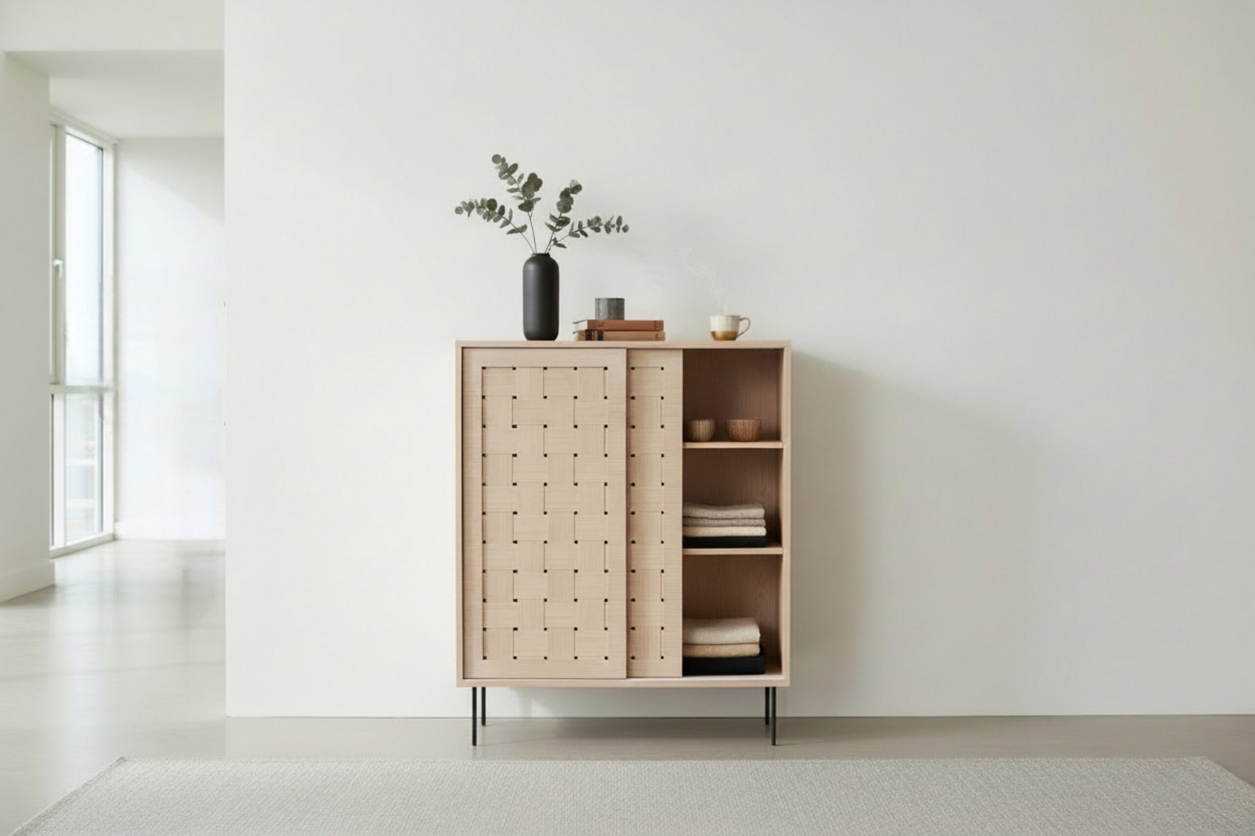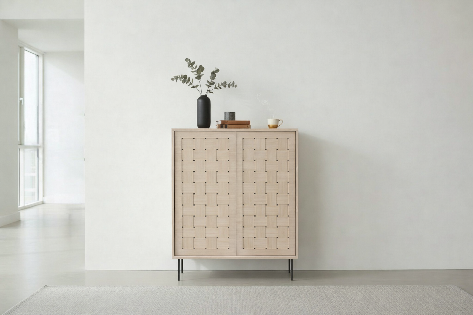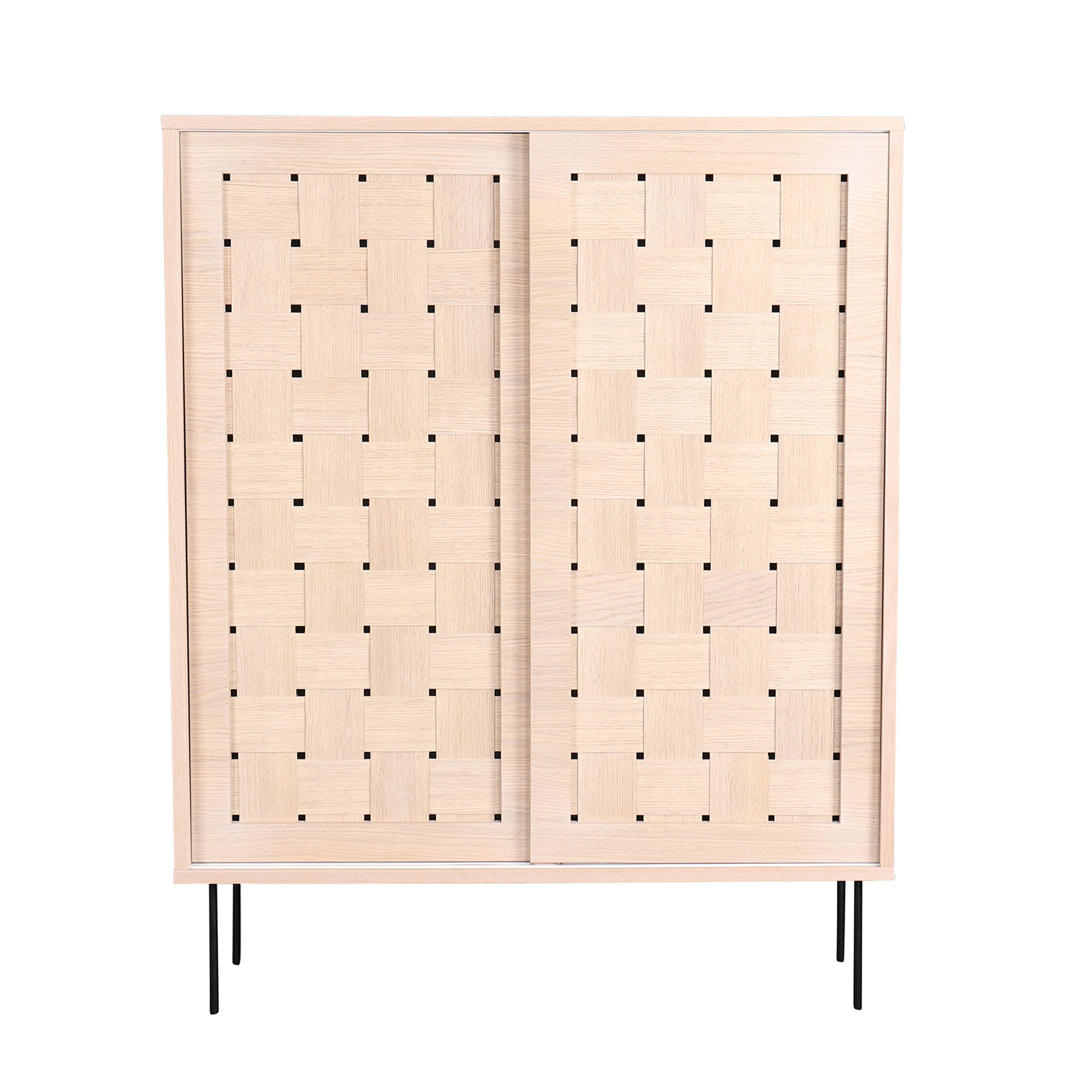 Detta eleganta highboard i ekfaner kombinerar modern design med naturliga material för att skapa en tidlös möbel som passar i alla hem. De flätade skjutdörrarna tillför en unik struktur och ger möbeln en sofistikerad känsla, samtidigt som de döljer rymlig förvaring för dina vardagsartiklar. De smala metallbenen ger en luftig och minimalistisk siluett som lätt smälter in i olika inredningsstilar. Med sin varma ton och högkvalitativa hantverk är detta sideboard både ett praktiskt och stilfullt tillskott till ditt hem, perfekt för såväl vardagsrum som matsal.