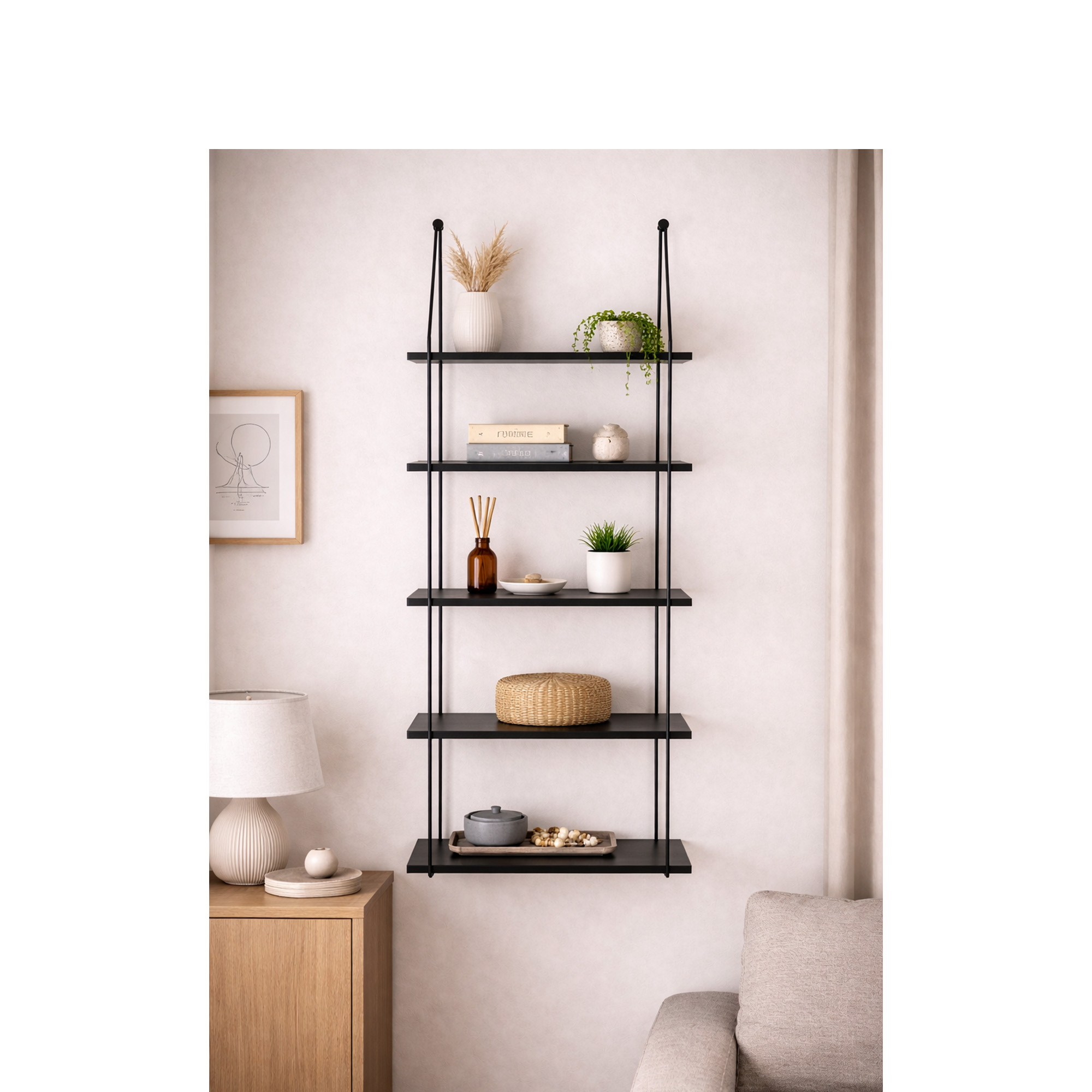 Vägghylla med 5 hyllplan i melamin och konsoll i metall.