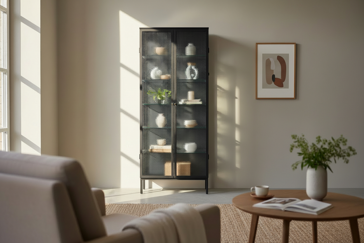 Ett elegant vitrinskåp i metall och glas med stilren, modern design. De räfflade glasdörrarna ger ett mjukt uttryck samtidigt som de framhäver innehållet på ett diskret sätt – perfekt för att visa upp dina favoritföremål i ett minimalistiskt hem.