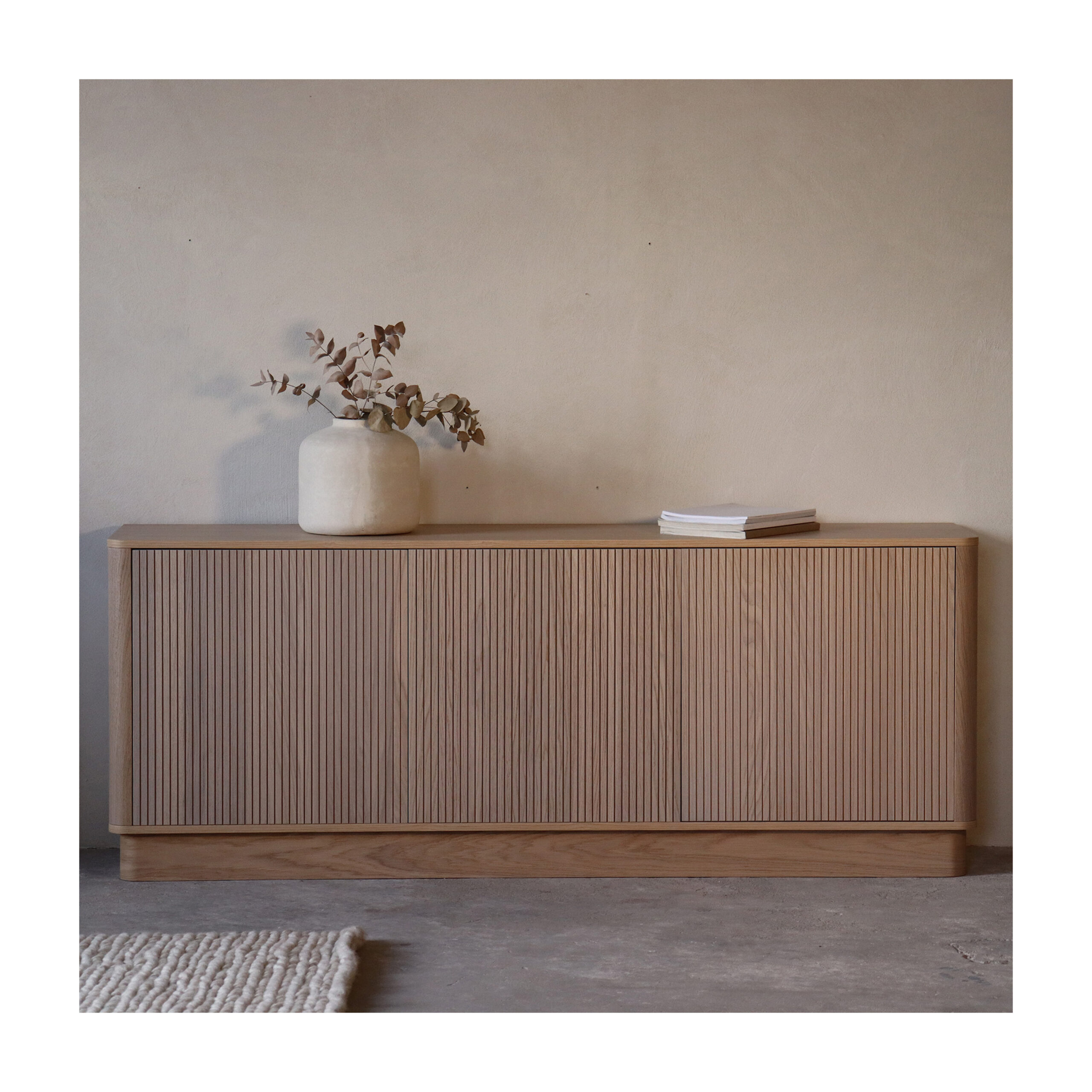 Stilrent sideboard i ekfaner – funktion möter form Med sina ribbade dörrar och mjukt rundade kanter blir detta skåp en elegant förvaringslösning i alla rum. Den ljusa ekfaneren ger en varm och naturlig känsla, medan den tidlösa designen smälter in sömlöst i både moderna och klassiska hem.