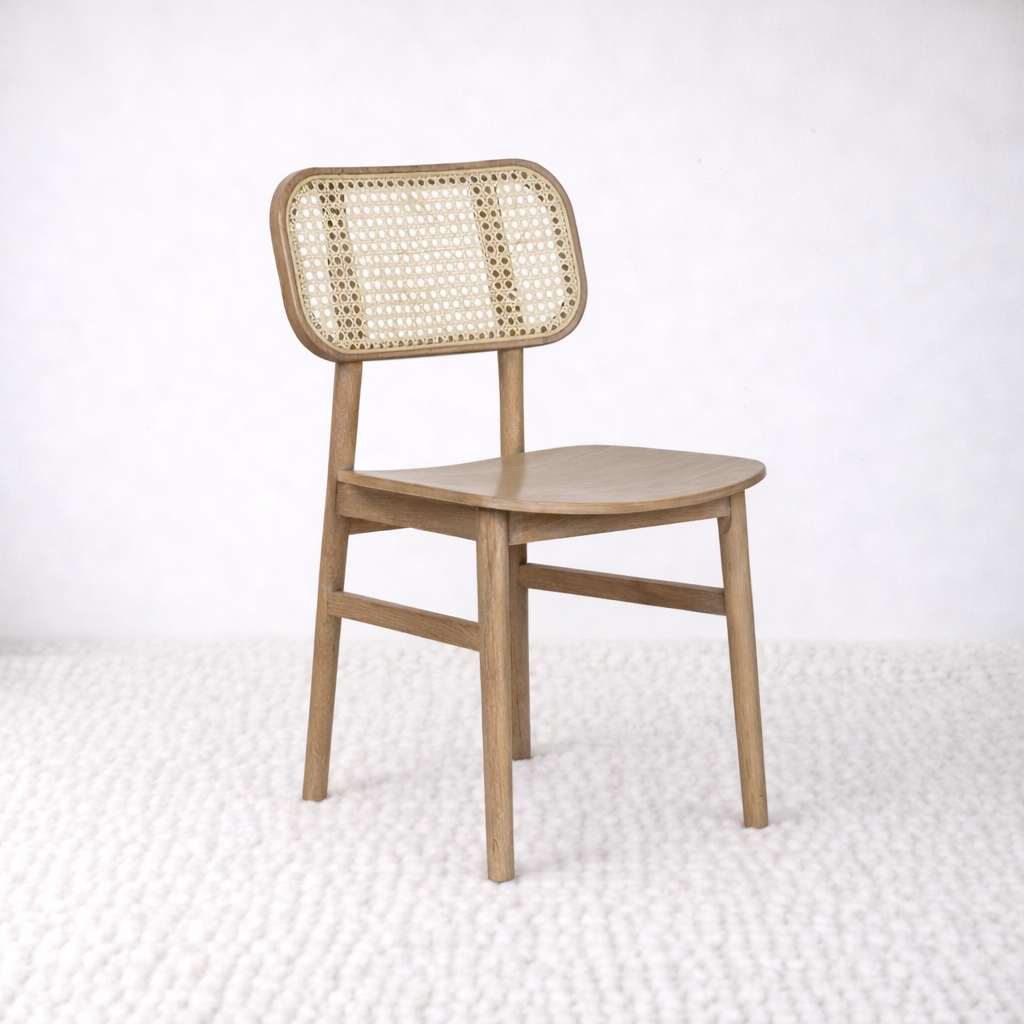 En stilren stol i massiv ek med ryggstöd i klassisk rottingflätning. Den kombinerar naturliga material med tidlös design och passar lika bra runt matbordet som i vardagsrummet. Robust, men samtidigt lätt och luftig i uttrycket.