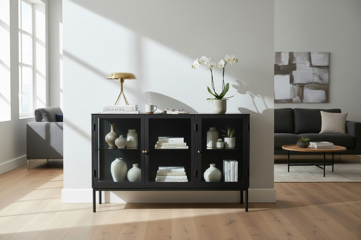 Detta stilrena sideboard kombinerar industriell elegans med tidlös design. Skåpet är tillverkat i svartlackerad metall och har 3 glasdörrar med strukturerat glas som ger ett sofistikerat uttryck samtidigt som innehållet skyddas och dämpas visuellt.