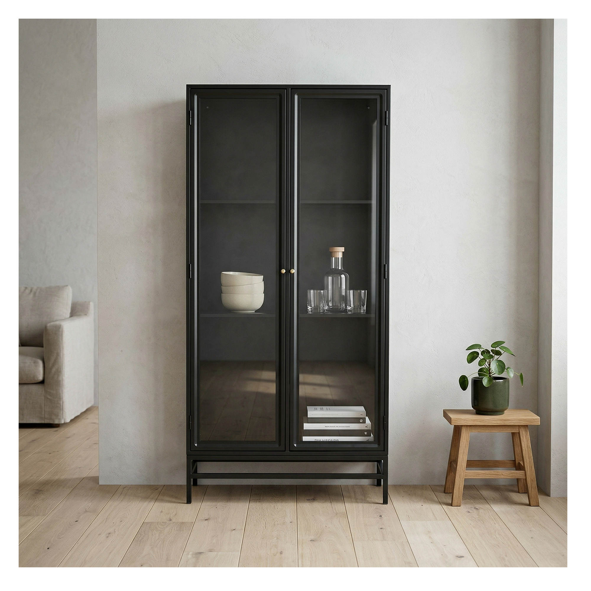 Den minimalistiska designen, med en slät svart ram och stora glasdörrar, skapar en luftig känsla som passar i både moderna och klassiska hem. De rymliga hyllorna ger gott om utrymme för att organisera allt från böcker till dekorativa detaljer.